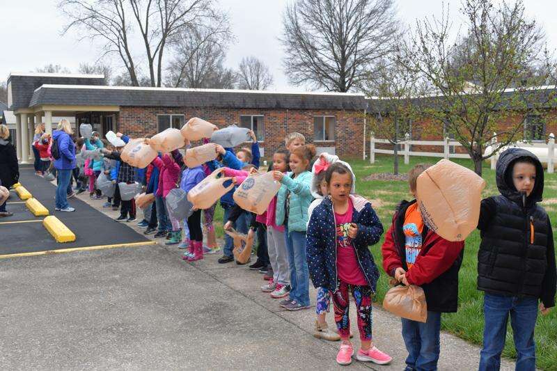 West Side Primary students let the brisk wind fill their plastic bags prior to the Easter egg hunt.
