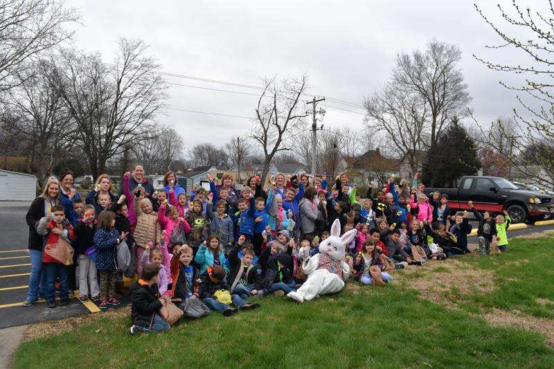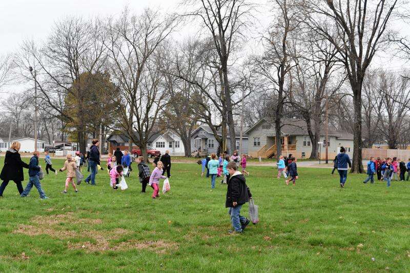 West Side Primary students fill the lawn at Saline Care Center searching for Easter eggs Tuesday morning.