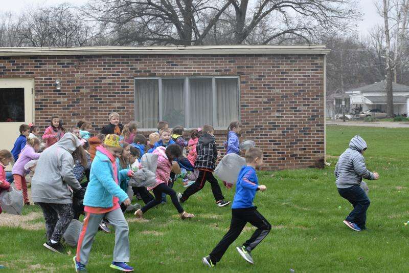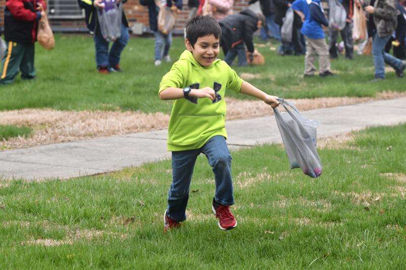 West Side Primary pupils rush to gather Easter eggs at Saline Care Center Tuesday morning.