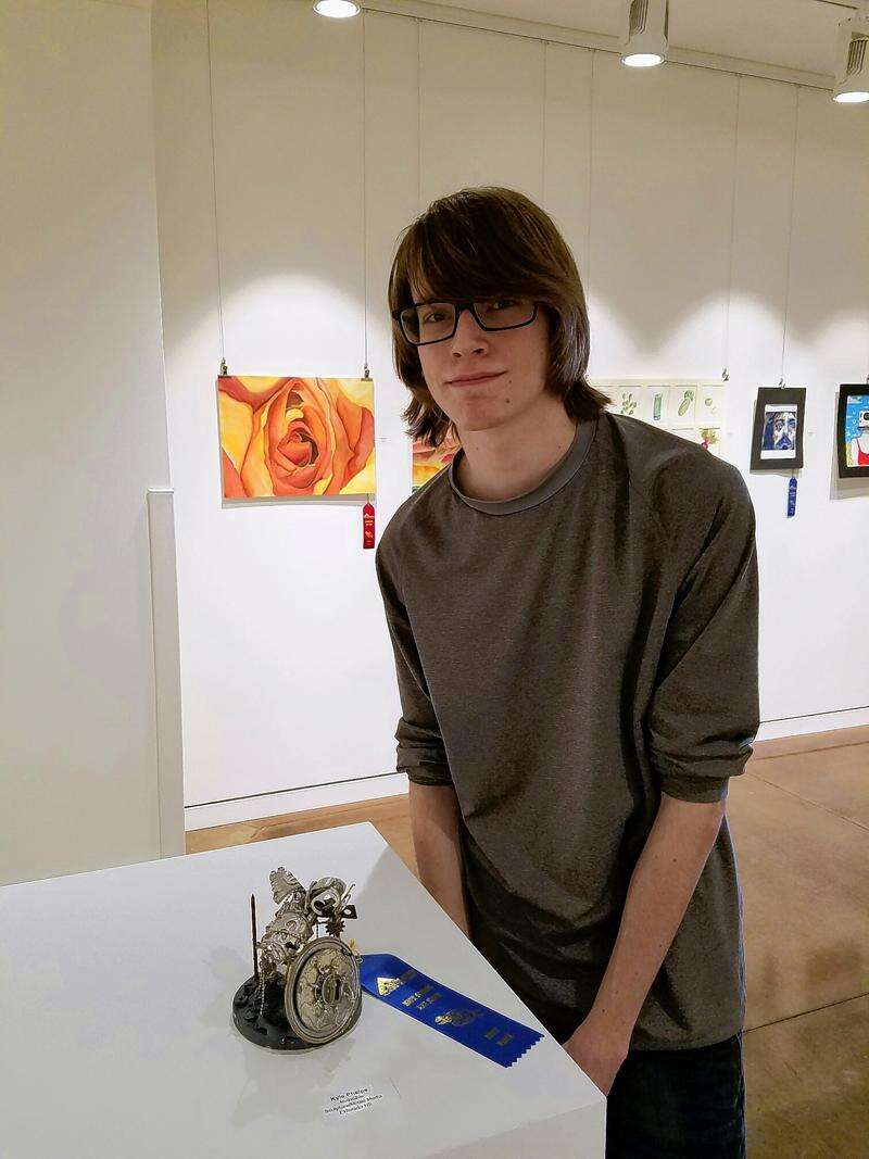 Kyle Phelps of Eldorado stands next to his mixed media work "Invincible" at the SIC High School Art Show.